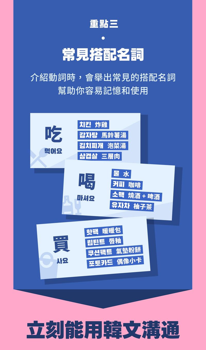 50+ 常用動詞三形態(一般/否定/疑問)+常用名詞,快速開啟韓文溝通。